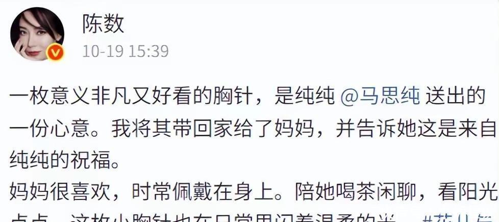 46岁陈数给妈妈庆生,拿马思纯给的胸针当礼物,没生孩子很遗憾 46岁的陈数最近在录《花儿与少年》,在国外拍的时候,马思纯买了胸针当礼物分给大家。巧了,那天正好是陈数妈妈的生日,她当时就跟马思纯说了,自己正愁没给妈妈挑好礼物,这胸针简直太合心意了,转送给妈妈成不成。 马思纯当然乐意,后来陈数把胸针带给82岁的妈妈,老人家知道是马思纯送的,还特地让女儿帮忙道谢呢。陈数妈妈是真优雅,头发挽得整整齐齐,戴着老花镜也掩不住那股体面劲儿,胸针别在灰色针织衫上,一下子就提亮了穿搭,母女俩都稀罕得不行。